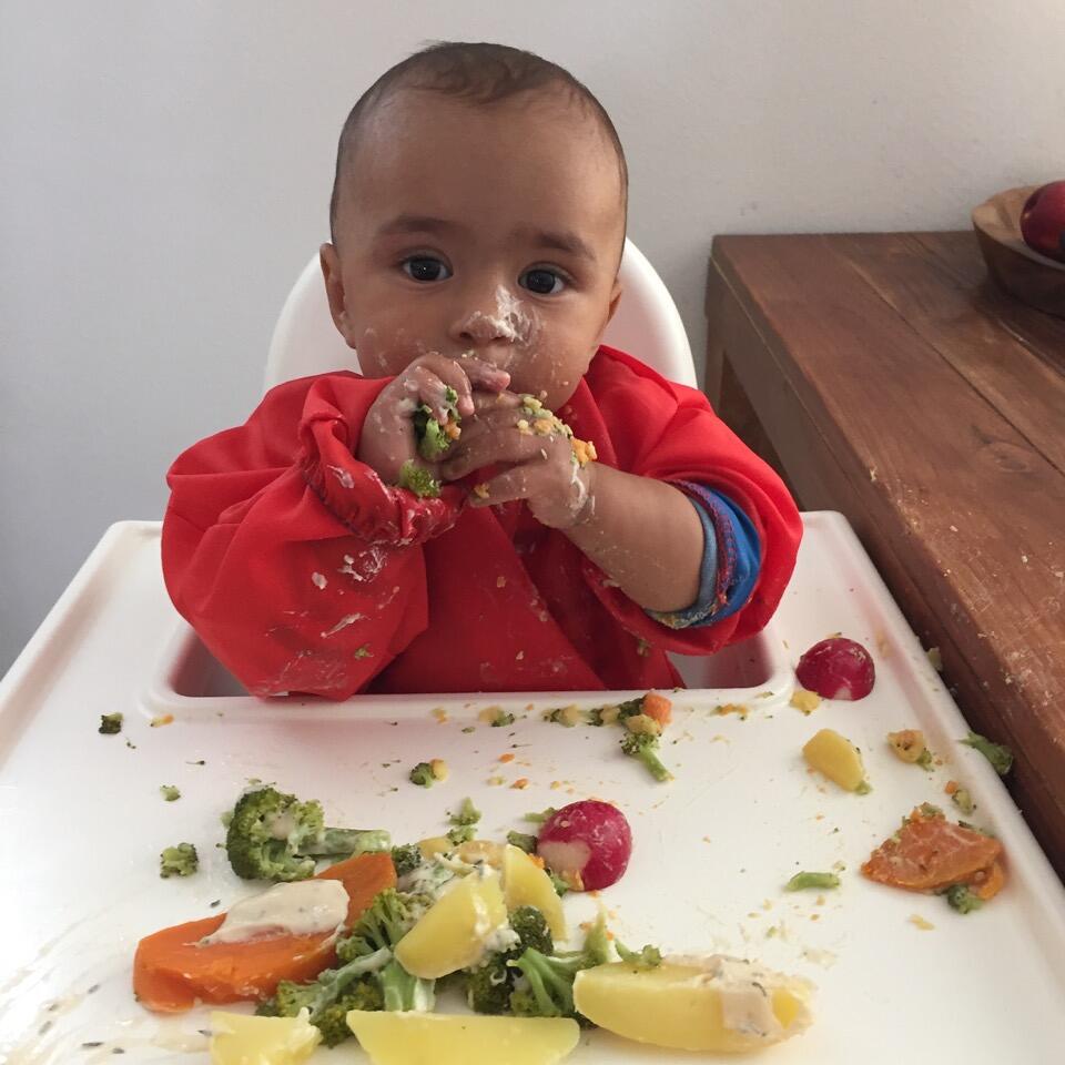 Ich salze erst, wenn ich seine Menge abgenommen habe. Und er kann so gut wie alles essen. Also normaler grüner Blattsalat ist jetzt schwierig. Aber er hat zum Beispiel mal ein gedämpftes Blatt Wirsing in der Hand gehalten. Das fand er super, weil er das ganz toll festhalten konnte. Das hat echt gut geklappt.